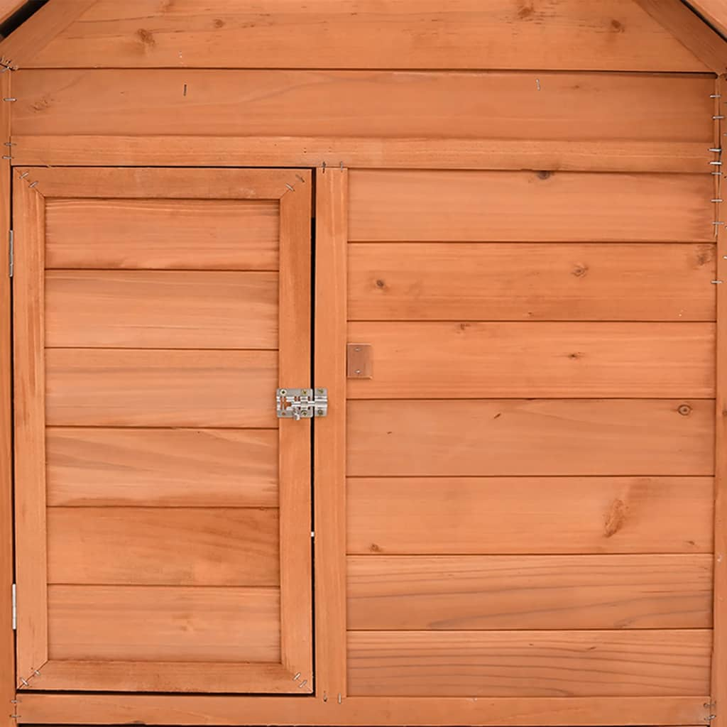 This wooden chicken coop is a perfect choice for feeding your chickens and keeping them comfortable. The hen house has been designed with a frontal window to allow fresh air in. It has two nest boxes, both with a roof that can be opened for the collection of eggs. The bottom tray can be pulled out for easy cleaning. The door is lockable from the outside with a latch. Made of solid firwood, the coop is durable and stable. The water-resistant fabric on the roofs keeps rain away, creating warm, comfortable resting areas inside the hen house.
