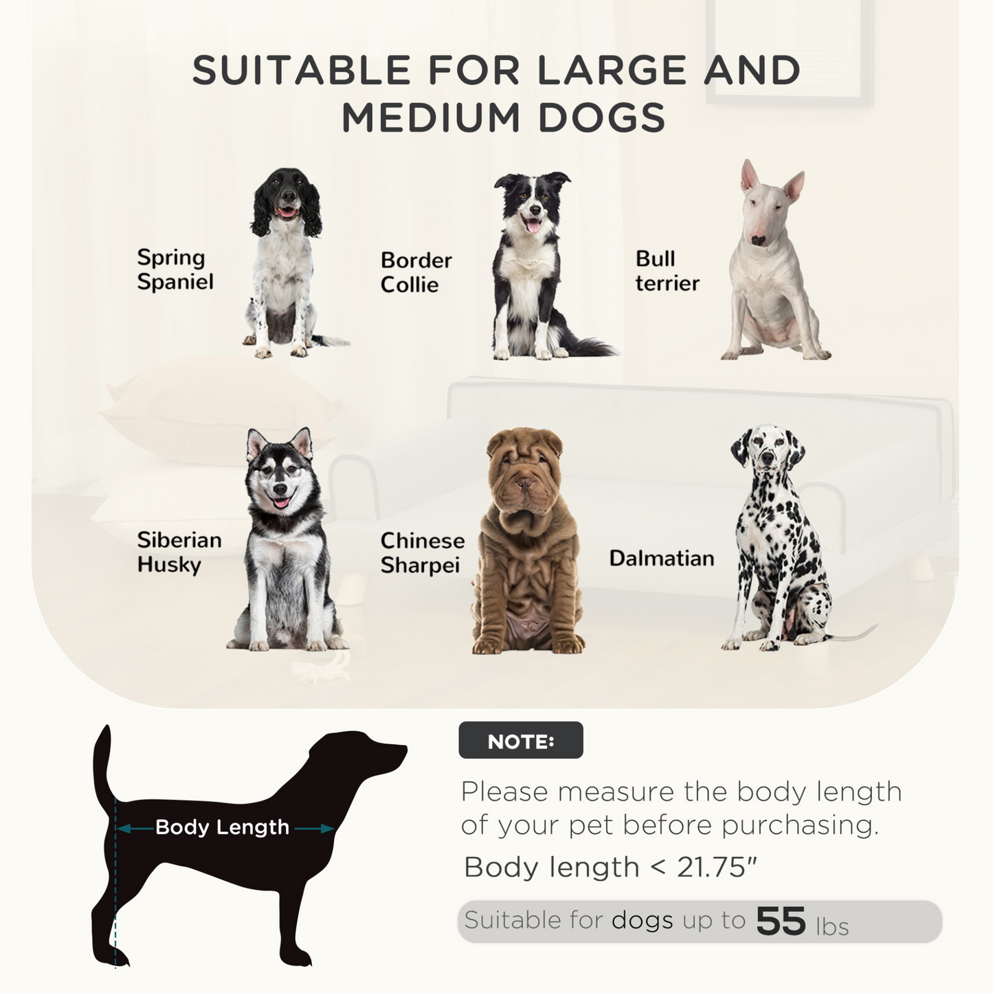 Large pet sofa: A spacious design, perfect for large and medium dogs. They have lots of room to stretch their body and fully relax. Comfortable: Plush upholstery is soft to the touch. This dog sofa comes with a thick main cushion, so they can lay comfortably. Easy to clean: It is easy to wipe down, preserved the dog chair from wetness and spills. The cushion cover is removable and washable, keeping their space clean and cosy. Wooden legs: Made from pine wood, it provides balance and stability, whilst stopping dampness from reaching their seat, making sure this dog couch remains snug. Dimensions: 32H x 100W x 62Dcm. Seat: Off the ground: 18H x 82W x 54Dcm. Suitable for large and medium dogs up to 25kg, and less than 55cm in length. Simple assembly required.
