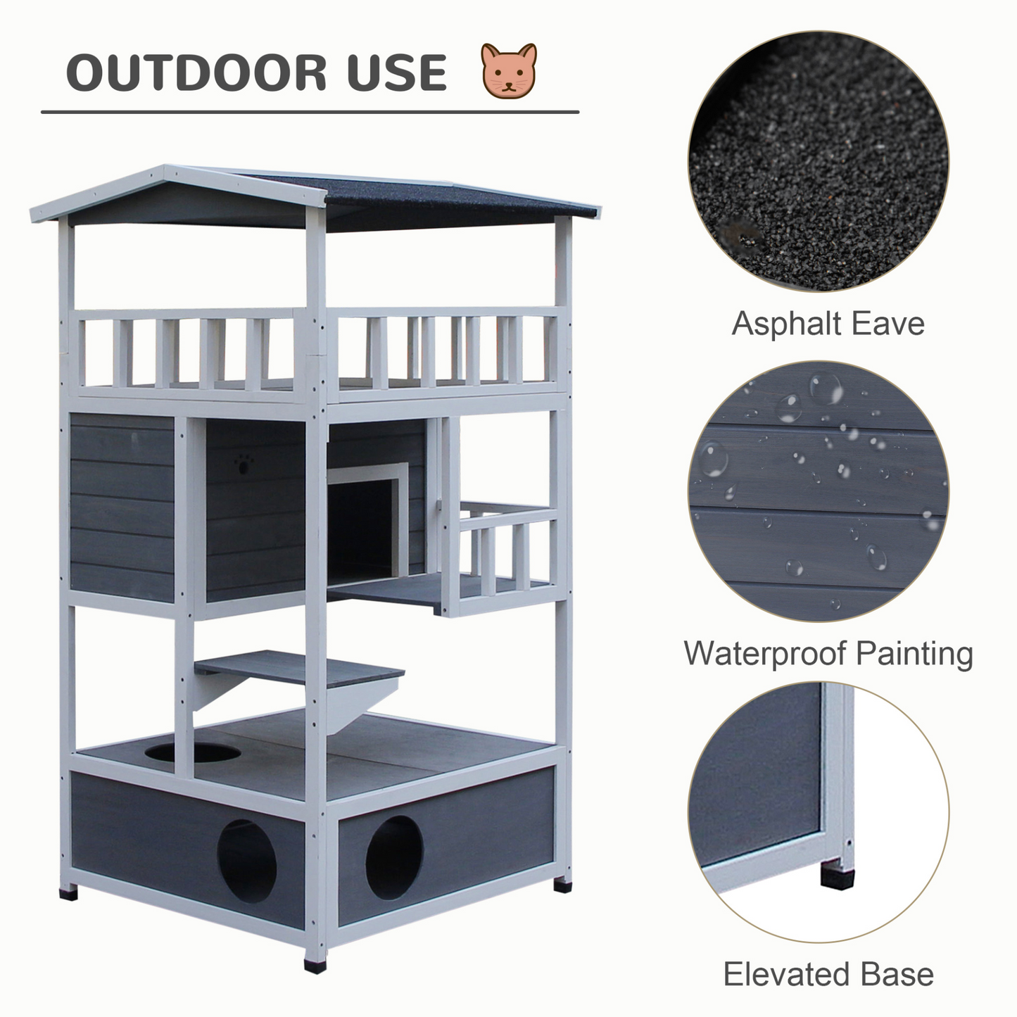 - PawHut Wooden Outdoor Cat House 3-Tier for Winter Kitten Shelter Lodge w/ Tilted Roof Terrace Jump Step Bottom Tray Elevated Base Waterproof Paint 140x78x76cm Grey