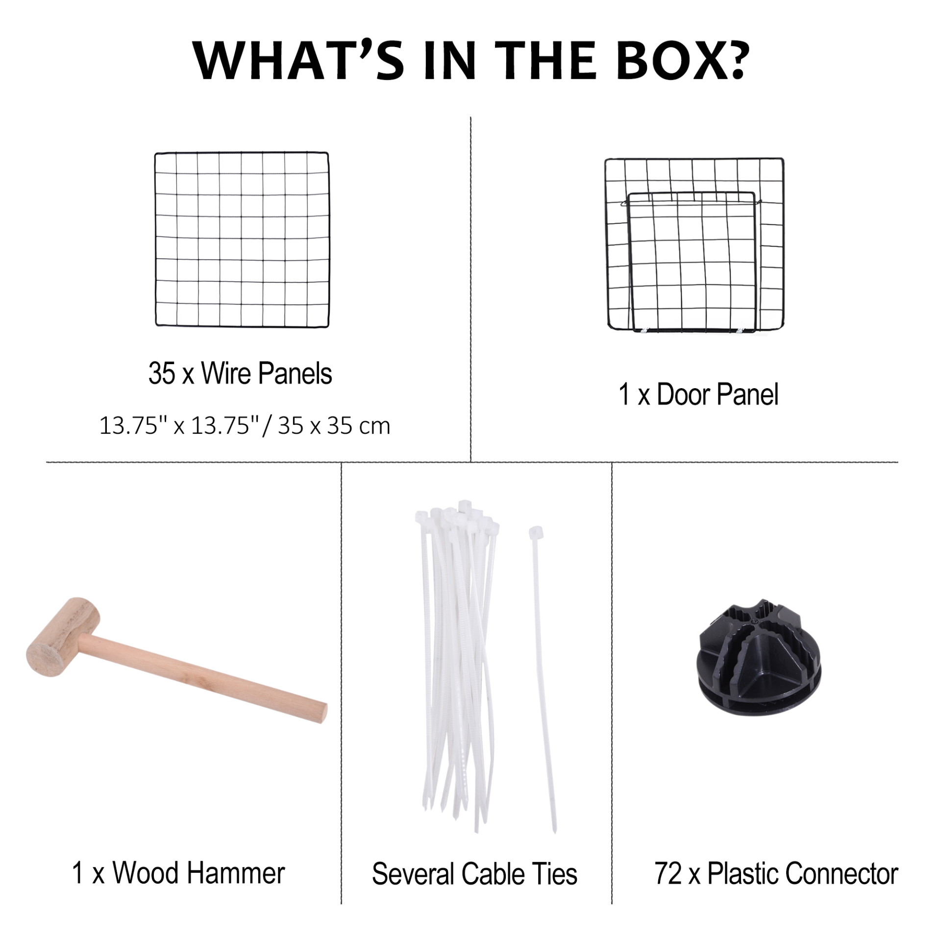 Set of 36: Freeform panel design allows you to be in control of the size and shape of the c&c cage. Easy to assemble and disassemble, it doesn't have to be a permanent addition to your home.Metal Wire: Strong and durable, keeping your pet enclosed. Open design stops your pet from feeling claustrophobic and provides them plenty of air.Built-in Door: Provides easy access in and out. SAFE: Rounded edges on corner to prevent any harm to your pet or you.Accessories Included: A mallet to knock into ground and connectors and cable ties to fix together.Dimensions: Single panel: 35L X 35Wcm. Mesh spacing: 4L x 4Wcm. SUITABLE FOR SMALL PETS.